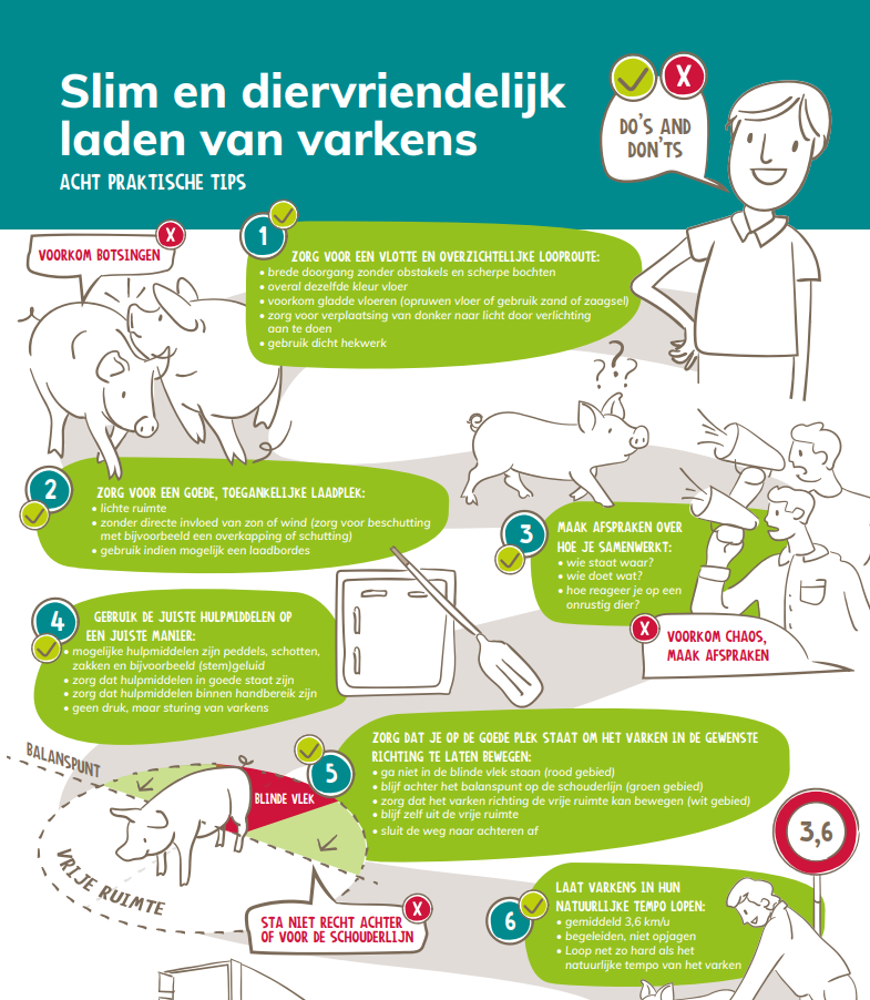 De flyer bevat acht praktische tips om het laden van varkens rustiger en slimmer te laten verlopen, met aandacht voor dierenwelzijn en werkcomfort, zonder dat grote investeringen nodig zijn.
